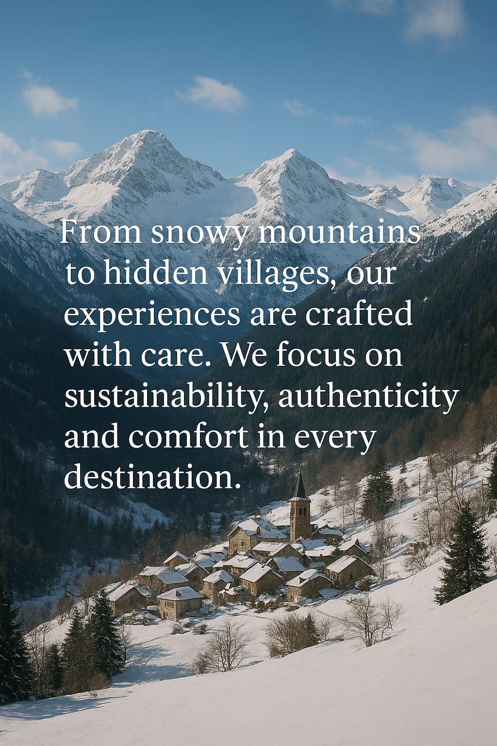 From snowy mountains to hidden villages, our experiences are crafted with care. We focus on sustainability, authenticity and comfort in every destination.